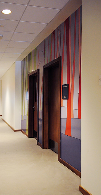 One of the main design features was a custom 'bench' in the student lounge, that stretches the entire length of the room, entwining multiple functions within one piece of furniture (a reception desk, reading nooks, work desks, and large seating areas for students to gather). Other design features consist of colorful 'forests' located at the entry of every classroom; prayer flag colors and symbols, as reminders that health and harmony are produced through the balance of doing good work within the community; photographs taken by students & staff members, depicting the various missions the school has undertaken to serve local neighborhoods and diverse communities abroad.